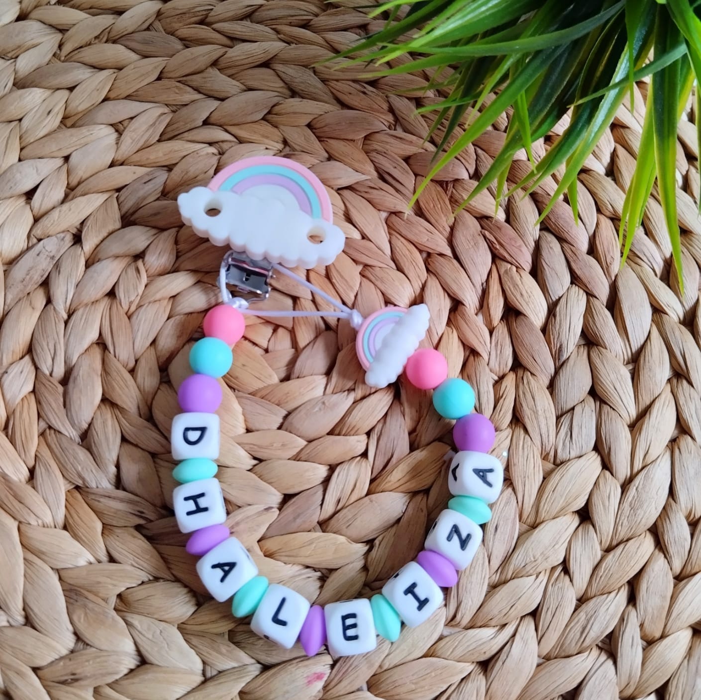 El chupetero de silicona personalizado modelo arco iris es el accesorio ideal para bebés en Canarias. Personalízalo con el nombre de tu peque y regala un detalle único para nacimientos, bautizos o baby showers. Un complemento práctico, original y lleno de color.