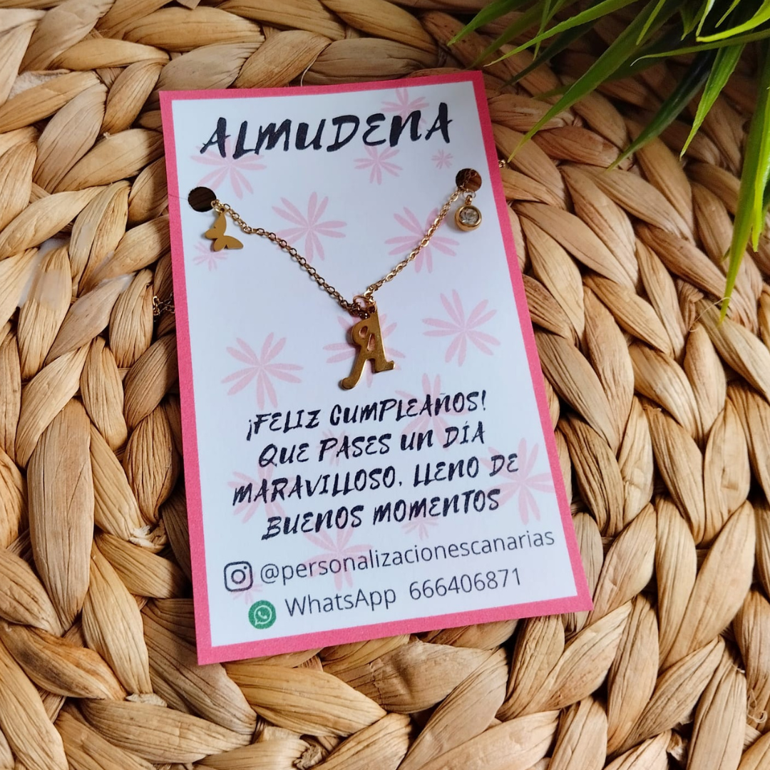 Sorprende con un detalle único y elegante: nuestro colgante de acero inoxidable con inicial y colgantes, presentado en una tarjeta personalizada con nombre y frase especial. Un regalo perfecto para cumpleaños, aniversarios, comuniones o cualquier ocasión importante en Canarias.