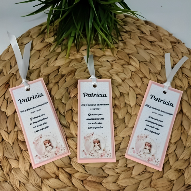 Cada marcapáginas se diseña de forma artesanal y se personaliza con el nombre del niño o niña, la fecha de la comunión y un mensaje especial, haciendo de este detalle un recuerdo duradero. Con diseños elegantes y temáticos, nuestros marcapáginas de comunión personalizados son ideales para complementar la decoración del evento o para incluirlos como parte de los recuerdos entregados a los invitados.
