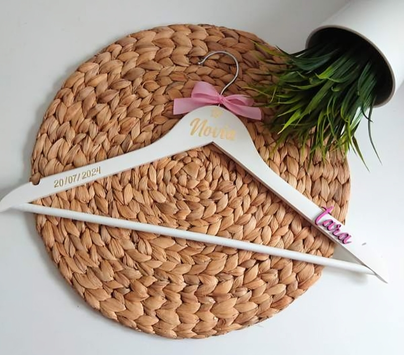 - Opción de texto personalizado con “novio” o “novia” para identificar cada percha.