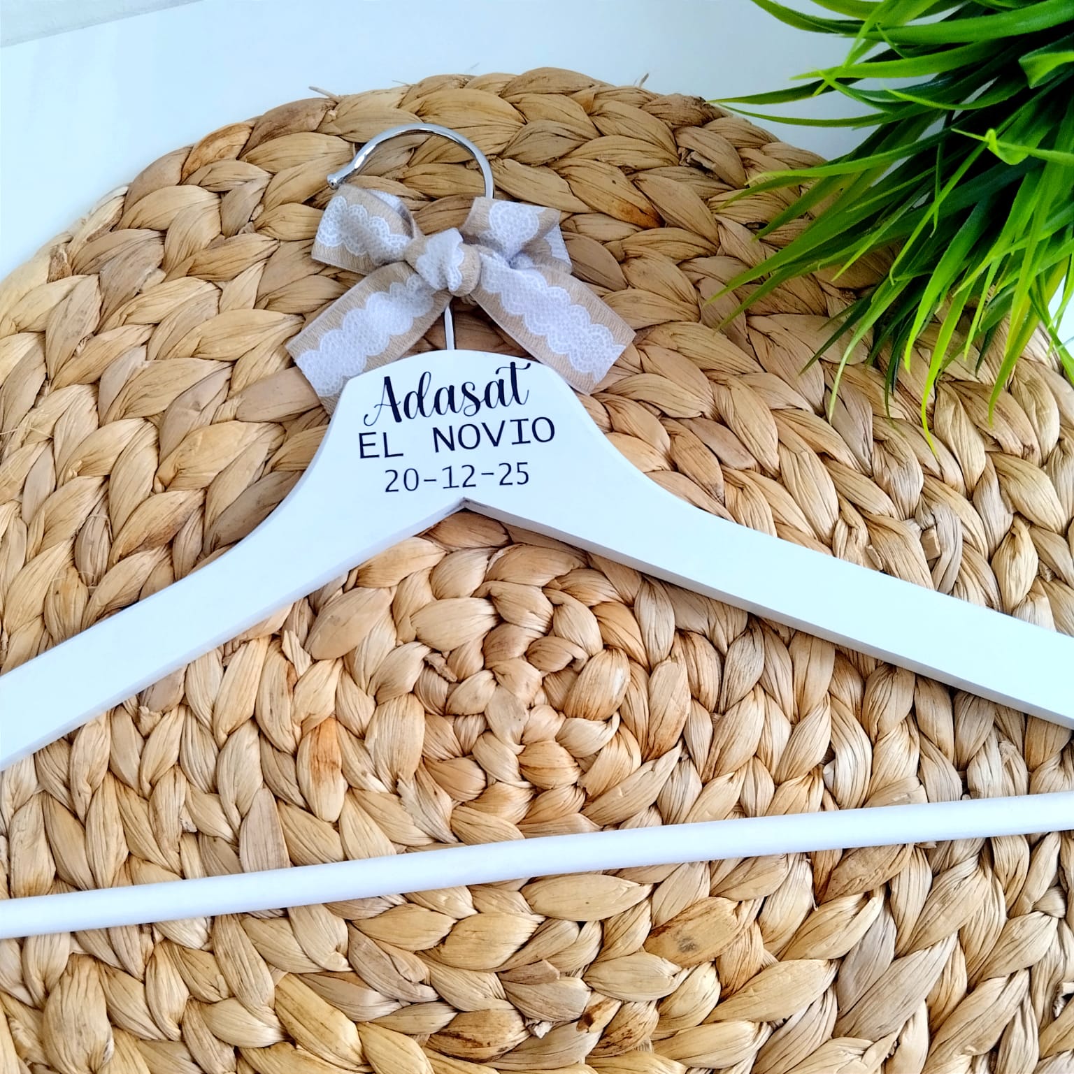 La percha para novio personalizada es un detalle elegante y práctico para el gran día. Ideal para colgar el traje del novio y añadir un toque especial a las fotos de la boda. Personalizada con nombre y fecha, es un recuerdo único pensado para quienes buscan detalles de boda personalizados en Canarias con estilo y significado.